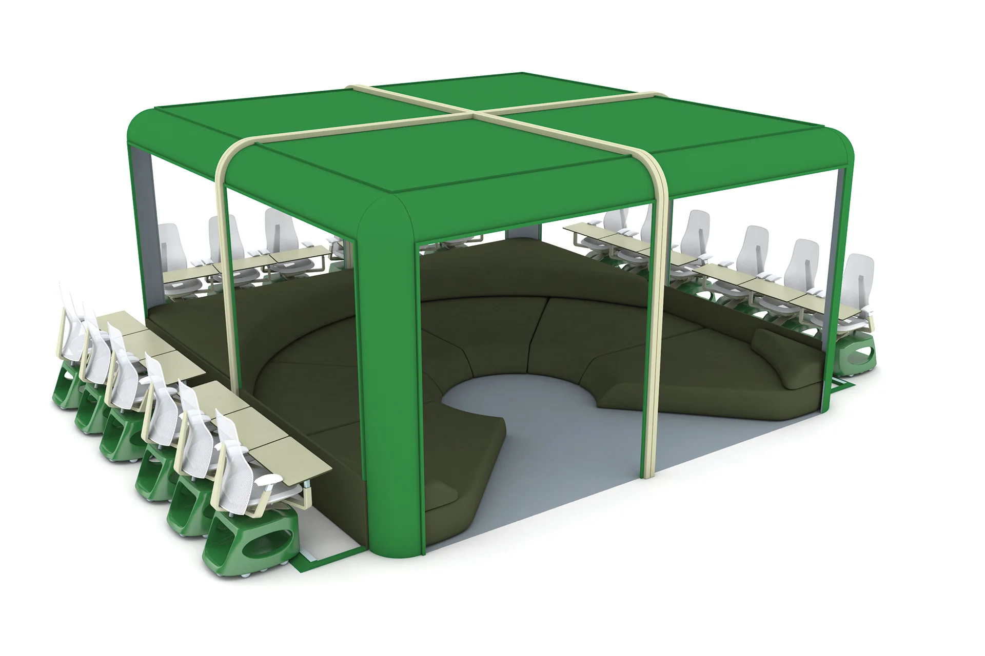 The Stella Link Chair can be used individually, or will attach to others to form a collaboration surface tailored to any number of users. The Stella Click Pod can be enclosed to form a controlled environment, a mini-theatre, or opened to form a multi-functional learning space with audiovisual capability. Stella Links can join the Stella Click Pod when open to create a third layer of participation.